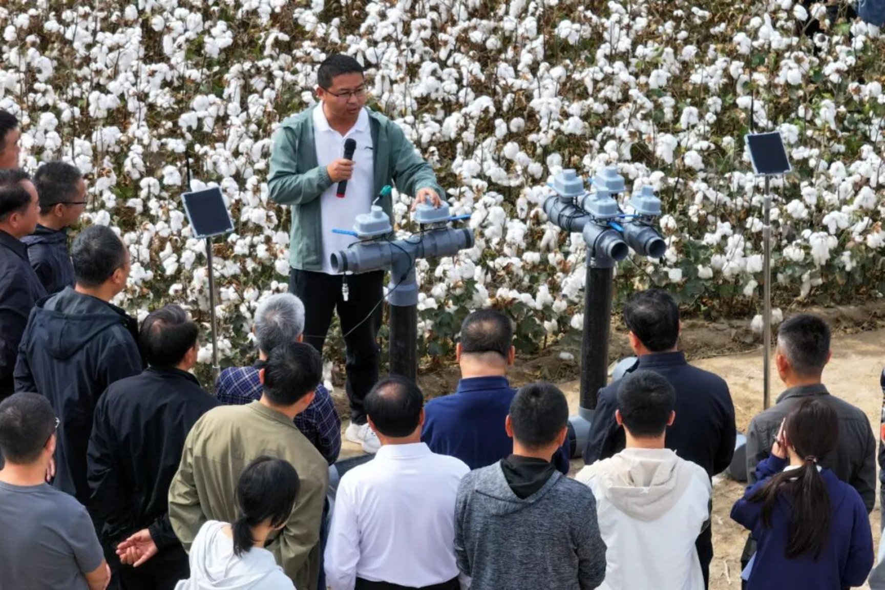 “多年来,团队通过总结在新疆的试验和示范经验,同时结合新疆的生产实际,自主研发了固液两用智能施肥机,手自一体智能球阀及智慧农业云端管理平台,达到了节省人工和提高水肥利用效率的目的,最终实现棉花产量和品质的双提高。经测产,这块示范田产量达到了539公斤,让144团更多职工享受到科技力量带来的红利。” 中棉所棉花智慧栽培创新团队副研究员杨北方说。