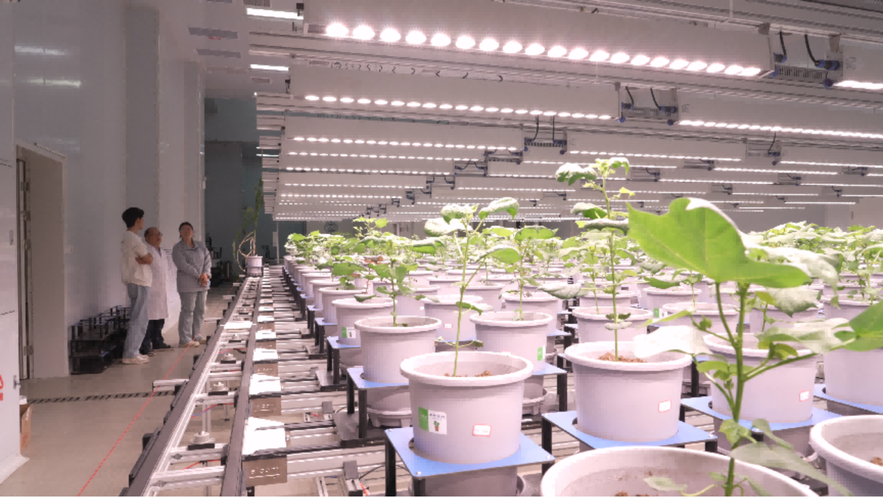 腊月的风,吹到海南三亚便暖融融了。在中国农业科学院国家南繁研究院表型大楼地下一层,近50米长的传送带正缓缓运转,一株株棉花幼苗在精密仪器下接受着“全身体检”。这里是国内领先的室内高通量表型采集平台,春节前夕,棉花及近缘植物种质资源创新利用团队研究员杜雄明正带着两名学生进行关键数据采集。