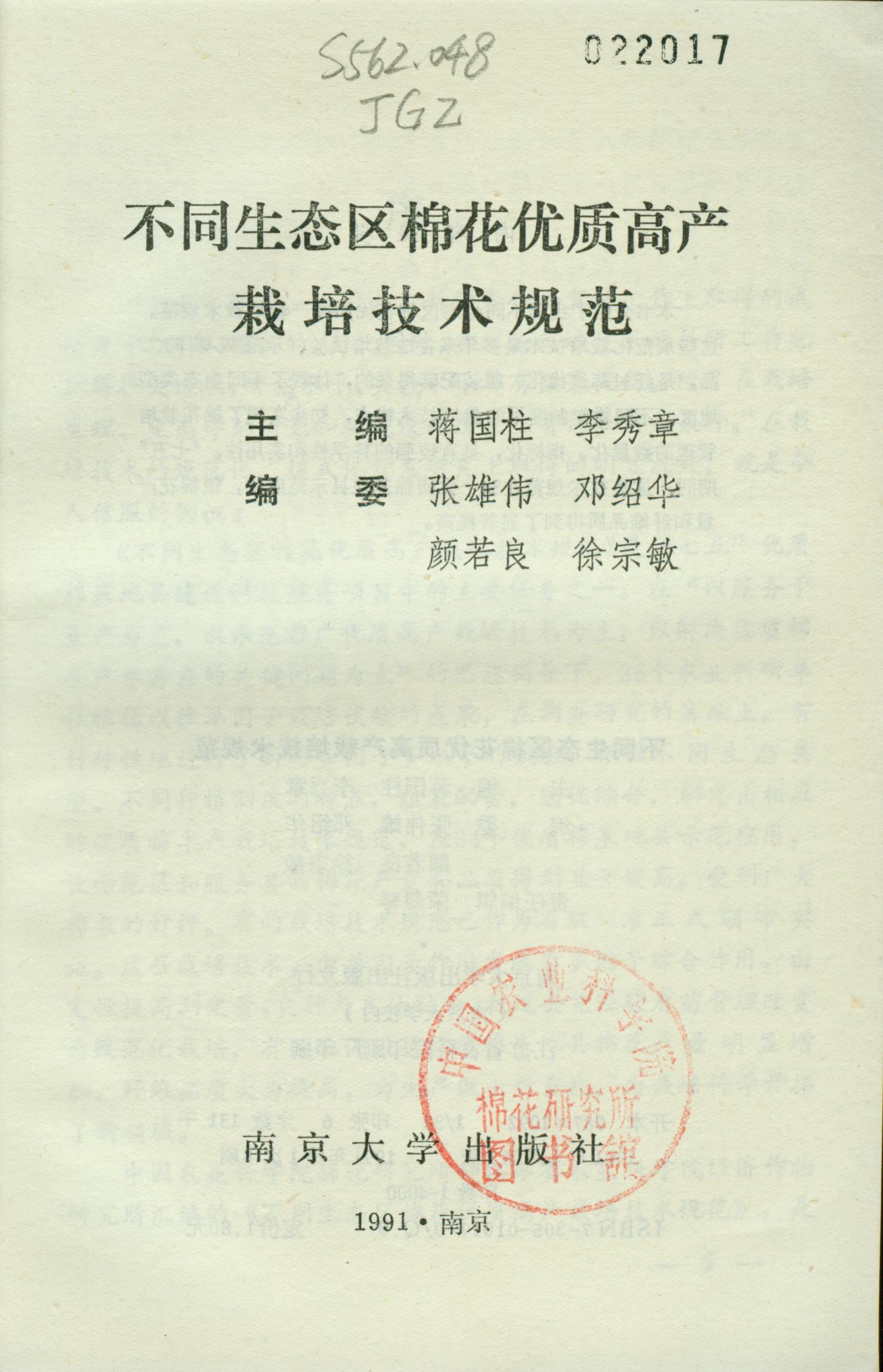 我所和江苏省农业科学院经济作物研究所编,蒋国柱、李秀章主编,1991年1月南京大学出版社出版。序2页,前言1页,目录3页,正文174页,13万1千字。