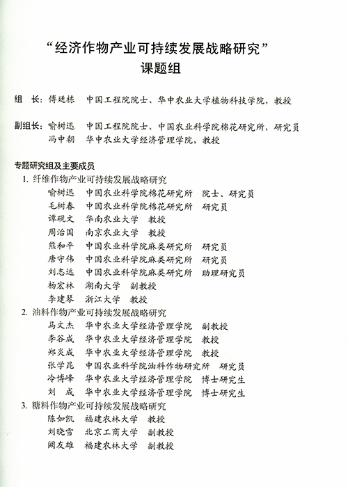 傅廷栋院士主编,我所喻树迅院士、毛树春研究员等参加编写,2017年10月科学出版社出版。内容提要1页,项目组顾问、组长、副组长和项目办公室人员名录1页,课题组人员名录1页,丛书序3页,前言2页,目录3页,正文241页,35.6万字。