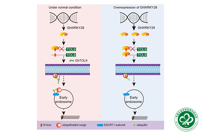 该研究通过整合全基因组关联分析(GWAS)和表达数量性状位点(eGWAS)分析,发现超过70%的eQTLs为远程调控eQTLs( trans -eQTL),并且 trans -eQTLs能够通过转录因子调控靶基因的表达。该研究进一步证实了GhWRKY28对GhTOL9基因表达的调控作用,并提出了一个新的调控棉花纤维细胞伸长的模型:GhWRKY28的低表达水平维持GhTOL9的正常转录,其过量表达则通过与W-BOX结合抑制GhTOL9的表达,从而阻断ESCRT途径下泛素化蛋白的降解,抑制纤维细胞伸长。研究结果将为培育优质、高产的棉花新品种提供更多的遗传位点。