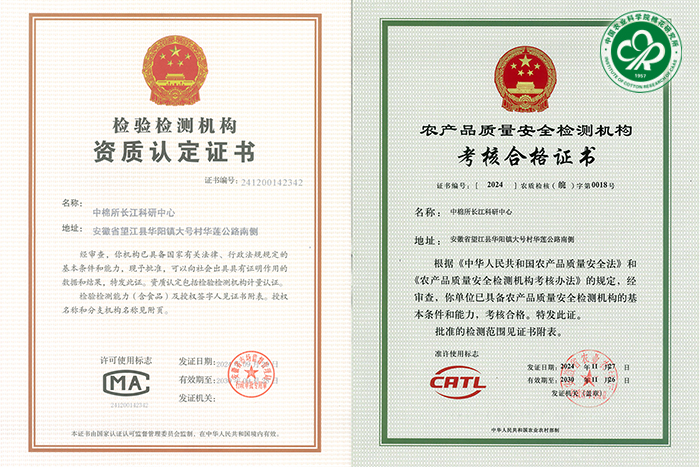 前期,安徽省市场监督管理局和安徽省农业农村厅分别委派专家组对中棉所长江科研中心检验检测中心“双认证”考核进行了现场评审。评审组依据相关评审规定从机构与人员、质量体系、仪器设备、检测工作、检验报告和环境条件等方面进行了全面、细致地考核审查。评审组一致认为,中棉所长江科研中心质量体系健全、岗位职责及权限明确,同意通过现场评审。