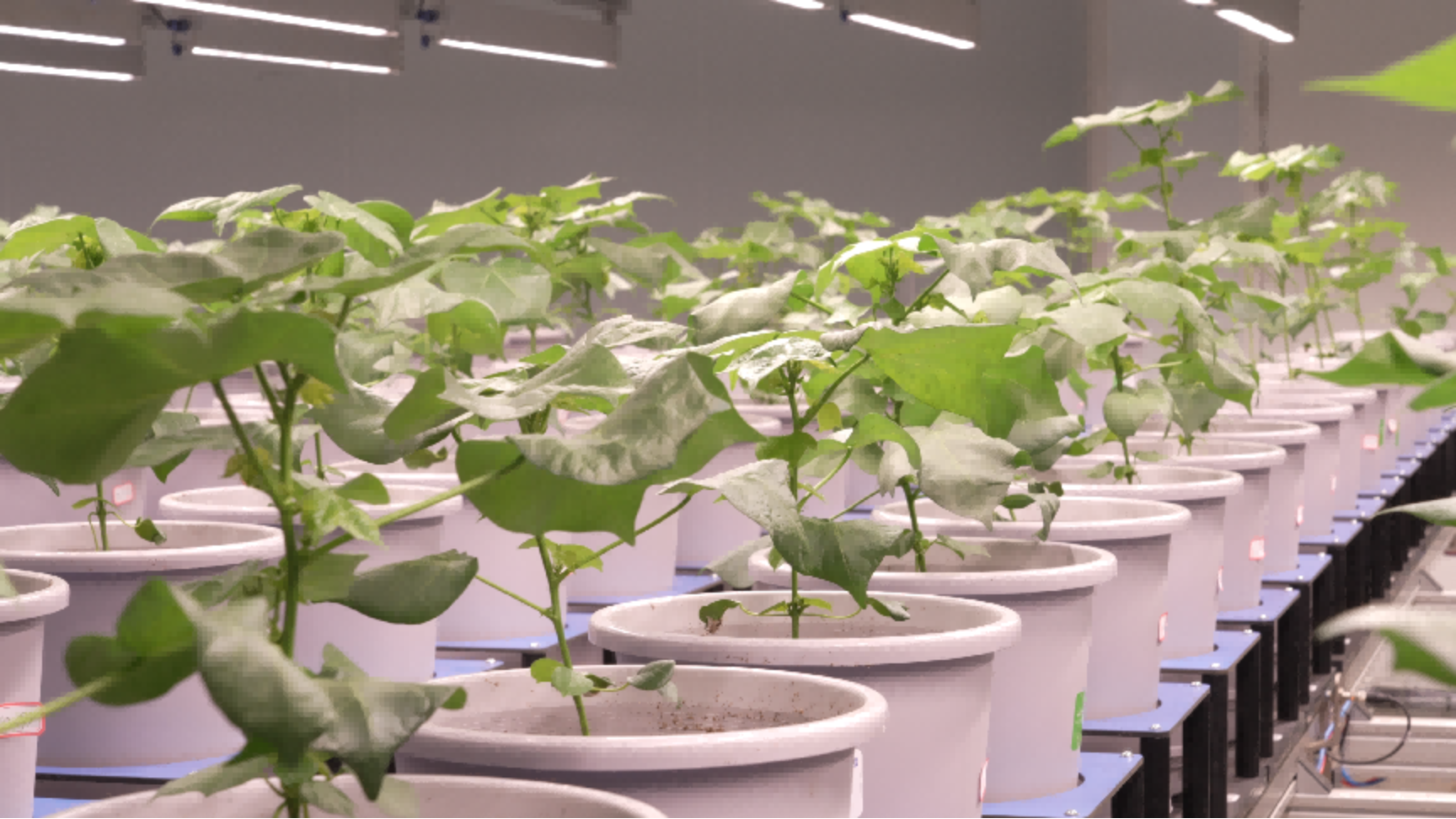 与传统育种相比,平台实现了从“群体观测”到“单株追踪”的跨越。杜雄明介绍,传输带上的每盆棉花底下都有一颗芯片,计算机会自动识别,标记它们的生长变化。“过去我们在田间是用笔记,用尺子量,现在无人机田间巡航结合室内单株追踪,效率提升百倍。”杜雄明略带兴奋地说。