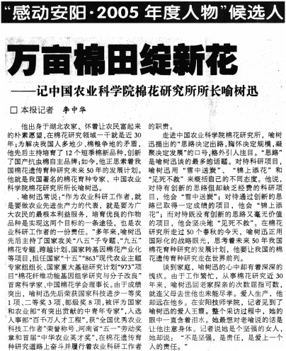 喻树迅入选“感动安阳·2005年度人物”侯选人名单